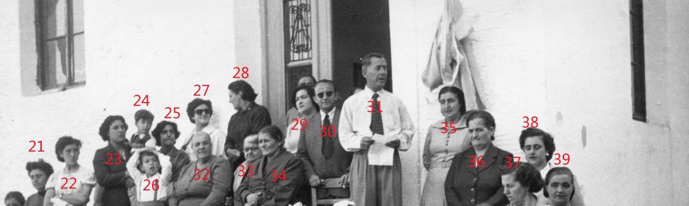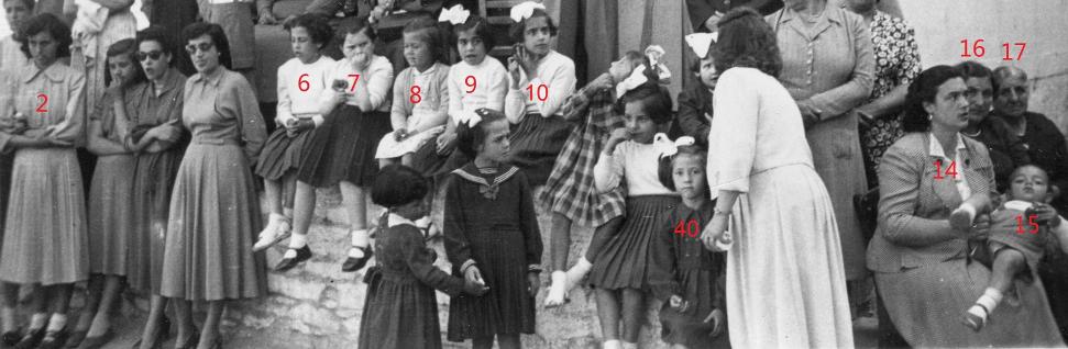 21. Παλαιοκρασσά Ξενούλα του Ευαγγέλου (11141362) #128 σύζ. Σαρρή Λεωνίδα του Αντώνη. 22. Πέτσα Αντωνία του Πέτρου (1287) #3962 σύζ. Πετράκη Στυλιανού 23. Μπάλση Ειρήνη του Ευαγγέλου (11243) σύζ. Πολέμη Διονυσίου του Νικολάου που κρατάει το γιο της 24. Πολέμη Βαγγέλη του Διονυσίου (11316153). 25. Παλαιοκρασσά Ειρήνη του Μιχαήλ (131542) σύζ. Πολέμη Δημητρίου του Ιωάννη και εμπρός της ο γιος της 26. Πολέμης Ιωάννης του Δημητρίου (11312411). Δεξιά από την Ειρήνη η αδελφή της 27. Παλαιοκρασσά Κατίνα του Μιχαήλ (131543) σύζ. Κυρτάτα Μιχαήλ του Φιλίππου. 28. Αγνωστη και μετά η 29. Παλαιοκρασσά Ειρηνούλα του Γεωργίου (13167) σύζ. Καρυστινού Σπύρου του Θεοχάρη με γυαλιά ηλίου ο 30. Βασιλόπουλος Μιχαήλ του Νικολάου (13) και ο δάσκαλος 31. Σάλαρης Γεώργιος του Κωνσταντίνου (1122241) 32. Παλαιοκρασσά Μαρία του Νικολάου (Κίτσα) (13153) σύζ. Σιγάλα Γεωργίου του Ιωάννη (Ψυχάρη) 33. Μαρή Ιουλία (Λασκαρώ) του Μιχαήλ (1131) σύζ. Βασιλόπουλου Νικολάου του Ιωάννη 34. Καρυστινού Φραεσκούλα του Θεοχάρη (162) σύζ. Πολέμη Σταμάτη του Δημητρίου