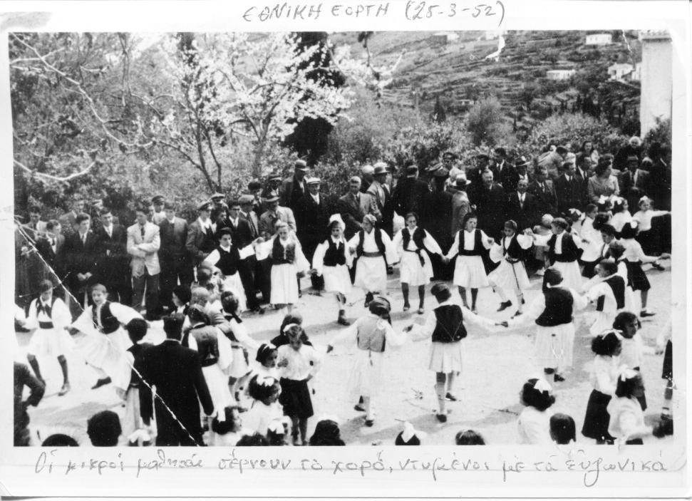 «Εθνική Γιορτή (25 - 3 - 52) Οι μικροί μαθητές σέρνουν το χορό, ντυμένοι με τα ευζωνικά»