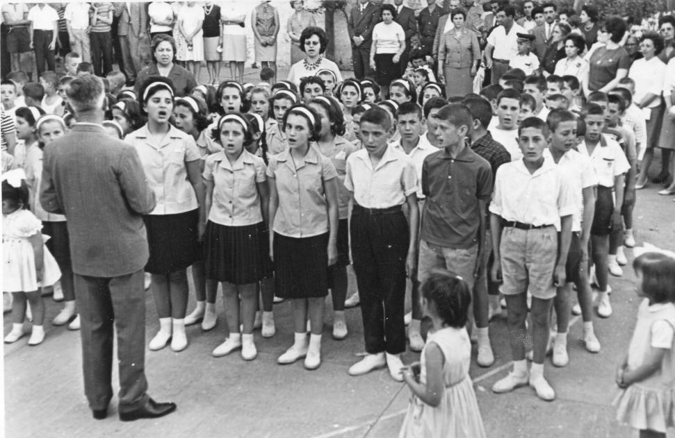 Στη διάρκεια κάποιας Εθνικής γιορτής. Οι μαθητές και οι μαθήτριες τραγουδούν τον εθνικό ύμνο.