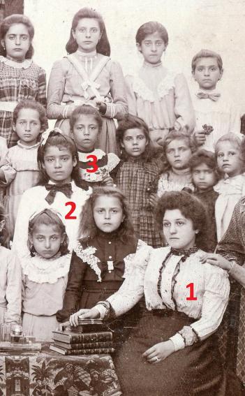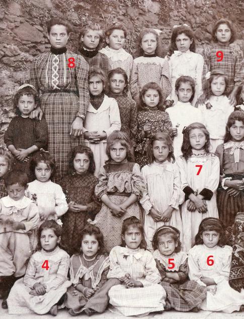 Όπως πολύ σωστά παρατήρησε η κα Μόσχα Μιχ. Γιαννίση, τα κορίτσια στις πίσω σειρές δεν πρέπει να ήταν μαθήτριες. Το Δημοτικό τότε είχε τέσσερις τάξεις, μετά ερχόταν το Σχολαρχείο (παλιότερος τύπος σχολείου που κάλυπτε τις δύο τελευταίες τάξεις του σημερινού Δημοτικού και την πρώτη τάξη του σημερινού Γυμνασίου) και τετραετές γυμνάσιο. Συνολικά ενδεκαετής εκπαίδευση, υποχρεωτικές οι τάξεις του τετραετούς Δημοτικού. Ο σωματότυπος αυτών των κοριτσιών δεν αντιστοιχεί σε μαθήτριες Δημοτικού 6 μέχρι 10 έστω 12 ετών. Το πιθανότερο να ήταν αδελφές που συνόδευαν μικρότερες μαθήτριες.