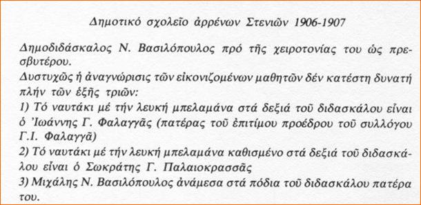 Ο παπαΝίκος χειροτονήθηκε 1 Οκτ. 1915. Ο Μιχάλης Βασιλόπουλος γεννήθηκε το 1913. Ο Σωκράτης Γ. Παλαιοκρασσάς γεννήθηκε το 1897 και ο Γιάννης Γ.Φαλαγκάς το 1900. Αν ήταν πράγματι ο Μιχάλης Βασιλόπουλος, τότε η φωτογραφία θα ήταν του 1915. Ο Σωκράτης θα ήταν τότε 18 ετών και ο Φαλαγκάς 15 - απίθανο να ήταν αυτοί στο δημοτικό. Αρα στη φωτογραφία δεν πρόκειται για τον Μιχάλη Βασιλόπουλο. Η ημερομηνία 1906-1907 με το γεγονός ότι ο Γιώργης Φαλαγκάς αναφέρει τον πατέρα του δείχνει ότι η ημερομηνία αυτή είναι σωστή. Ο Βασιλόπουλος είχε πάντα στις φωτογραφίες τα παιδιά του κοντά του. Το παιδί (τριών - τεσσάρων ετών περίπου) στα πόδια του δάσκαλου κατά πάσα πιθανότητα πρέπει να είναι ο μεγαλύτερος γιος του Γιάννης που γεννήθηκε το 1903 και ο οποίος αργότερα ξενιτεύτηκε στην Αμερική. Αυτή πρέπει να είναι και η μοναδική φωτογραφία του Γιάννη που υπάρχει στον ιστότοπο.