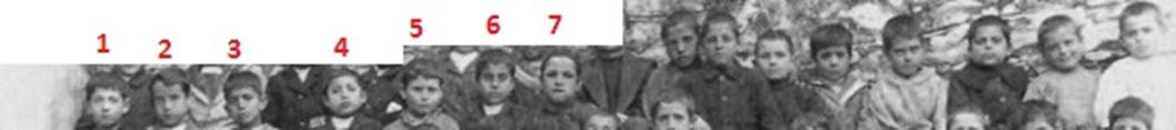 1.Βασιλόπουλος Μιχαήλ του Νικολάου (13) #2520 info (βρέφος) (σημ. δεδομένου ότι ο Βασιλόπουλος γεννήθηκε το 1913, δεν αποκλείεται η φωτογραφία να είναι και του 1914), 2. Καραπιπέρης Λεωνίδας του Νικολάου (Πάταλος) (13181) #1908 info, 3. Εξαδάκτυλος Αντώνιος του Νικολάου (125) #488 info, 4. Κουρτέσης Γεώργιος Ιακώβου (Λιάτσι) (132) #4749, 5. Μαργέτης Μιχαήλ του Ιωάννη (Γιάννη- Γιάννη ή Λάος) (13) #3806, 6. Μπέης Γεώργιος του Νικολάου (Κόπελος) (11232) - , (οι: 3ος, 4ος, 5ος και 6ος είναι οι καθήμενοι οκλαδόν).