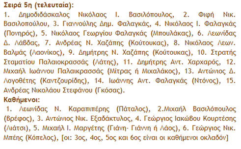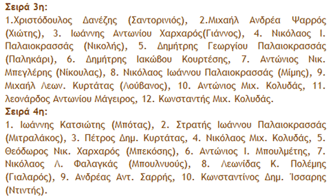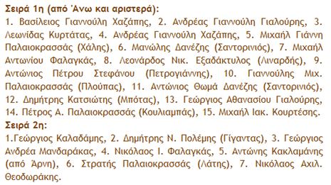 1. Χαζάπης Βασίλειος του Γιαννούλη (11312) #302 info, 2. Γιαλούρης Ανδρέας του Γιαννούλη (12225) #2941 info, 3. Κυρτάτας Λεωνίδας (?), 4. Χαζάπης Ανδρέας του Γιαννούλη (11311) #301 info, 5. Παλαιοκρασσάς Μιχαήλ του Ιωάννη (Χάλης) (111183) #2887 info, 6. Δανέζης Μανώλης (Σαντορινιός), 7. Φαλαγκάς Μιχαήλ του Αντωνίου (152) - , 8. Εξαδάκτυλος Λεονάρδος του Νικολάου (Λιναρδής) (123) #487 info, 9. Στεφάνου Αντώνιος του Πέτρου (Πετρογιάννης) (171) #375 info, 10. Παλαιοκρασσάς Γιαννούλης του Μιχαήλ (Πλούπας) (111211411) #3233 11. Δανέζης Αντώνιος του Θωμά (Σαντορινιός), 12. Κατσιώτης Δημήτρης (Μπότας), 13. Γιαλούρης Γεώργιος του Αθανασίου (12235) #2966 , 14. Παλαιοκρασσάς Πέτρος του Αντωνίου (Κουλιαμπάς) (14145) - , 15. Κουρτέσης Μιχαήλ του Ιακώβου (137) - .