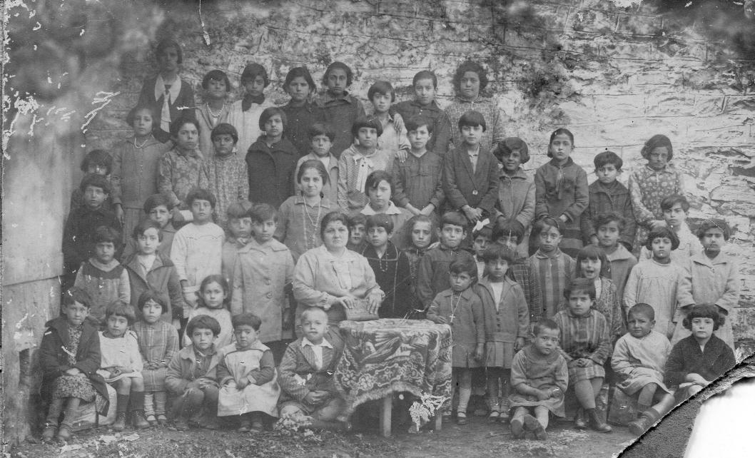 Δημοτικό σχολείο, έτος 1930. Η δασκάλα είναι η Μαρή Λασκαρώ - Ιουλία του Μιχαήλ σύζ. Βασιλόπουλου Νικολάου του Ιωάννη, λίγο πριν βγει στη σύνταξη (στο τέλος του 1930).