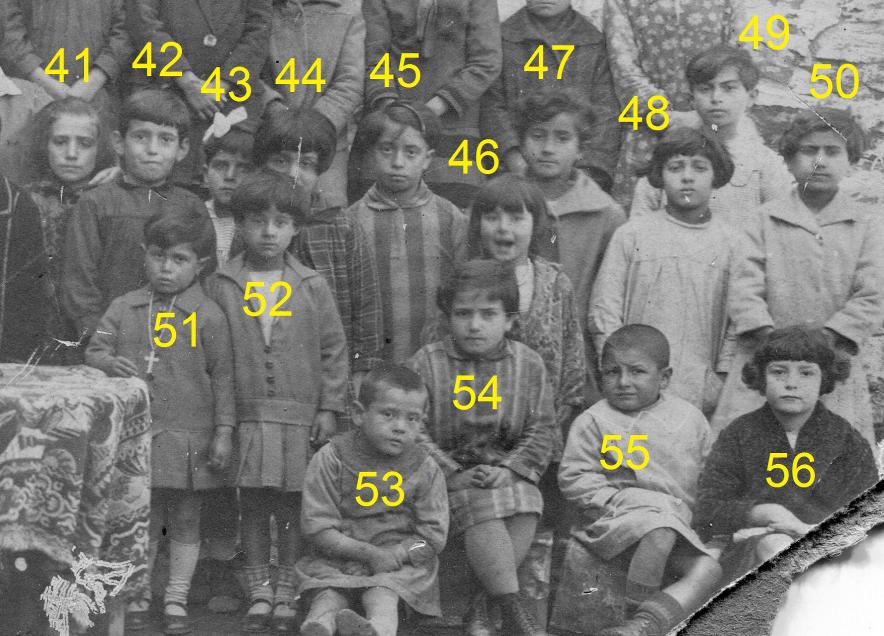 41. Μπουλμέτη Αθηνά του Ιωάννη (137) #3801 info σύζ. Μανδαράκα Νικολάου του Ιωάννη 42. Ζιώτη Κατίνα του Μιχαήλ (1243) - 43. ίσως η Ξηροπαΐδη Μαριώ του Γεωργίου 44. ίσως η Μπέη Πίτσα του Μιχαήλ 45. Χαζάπη Αδαμαντία του Κωνσταντίνου (12242) #209 info σύζ. Μπουκουβάλα Νικολή του Αντωνίου 46. Αγνωστη 47. Φαλαγκά Μόσχα του Νικολάου (14343) #2011 σύζ. Μπέη Νικολάου του Μιχαήλ 48. Στεφάνου (?) του Αντωνίου (Φόρα) 49. Αγνωστη 50. Ζαννάκη Ειρήνη του Λεωνίδα (161) - info σύζ. Κυρτάτα Αθανασίου του Δημητρίου 51. Μπουκουβάλα Μαρίκα του Αντωνίου (115) #1700 info σύζ. Εξαδάκτυλου Δημητρίου του Νικολάου 52. Κουτσούκου Γεωργία του Αντωνίου (1294) #2242 info σύζ. Ρηγόπουλου Σταμάτη του Θεοδοσίου 53. Κυρτάτας Μιχαήλ του Νικολάου (112213331) #2079 info 54. Αγνωστη 55. Στεφάνου Γιάννης του Δημητρίου (113) #93 info 56. Τζουμέζη Ειρηνούλα του Αριστείδη (11723) #822 info σύζ. Δαγιάση Δημητρίου του Ματθαίου