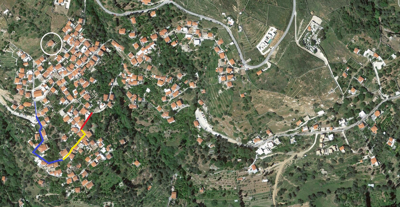 Πάνω: Στη δορυφορική φωτογραφία, η διαδρομή σημειώνεται με κόκκινη γραμμή. Σε άσπρο κύκλο φαίνεται το σπίτι του Θεοχάρη Ελευθ. Καρυστινού. |