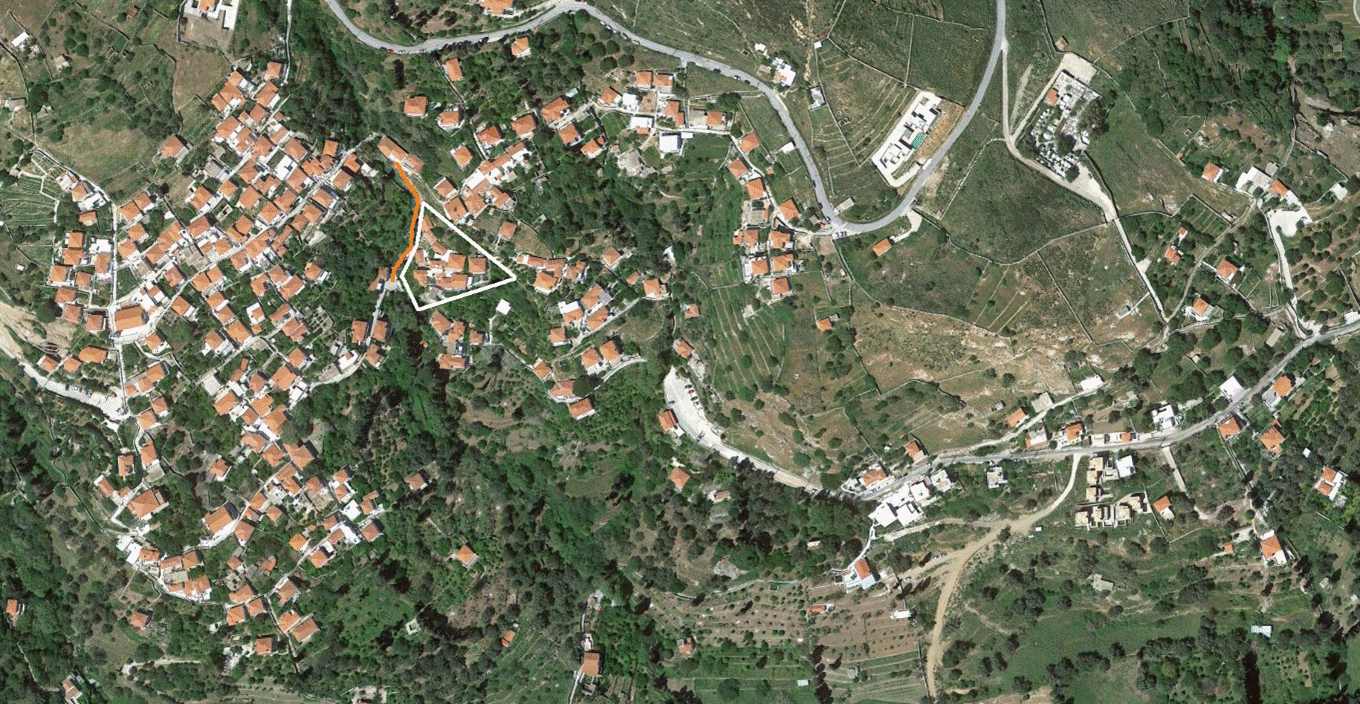 Αριστερά και πάνω: Στη δορυφορική φωτογραφία, ο Κακόβολος σημειώνεται με πορτοκαλιά γραμμή και δίπλα του ο Σκορδομαχαλάς περικλείεται στην άσπρη γραμμή.
