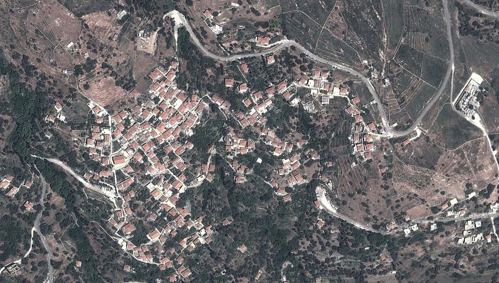 Κάτω: Στη δορυφορική φωτογραφία, με πράσινο χρώμα σημειώνεται η διαχωριστική γραμμή μεταξύ του Απανωχωριού και Κατωχωριού. |