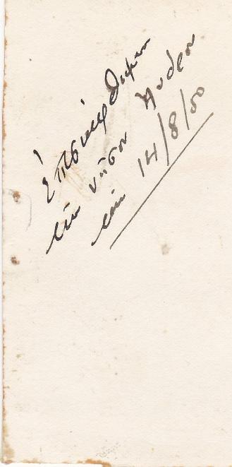 Την ίδια φωτογραφία προσέφερε και η κα Μαρία Σγουρίδου. Στο πίσω μέρος της υπάρχει γραμμένη η ημερομηνία 14/8/50.