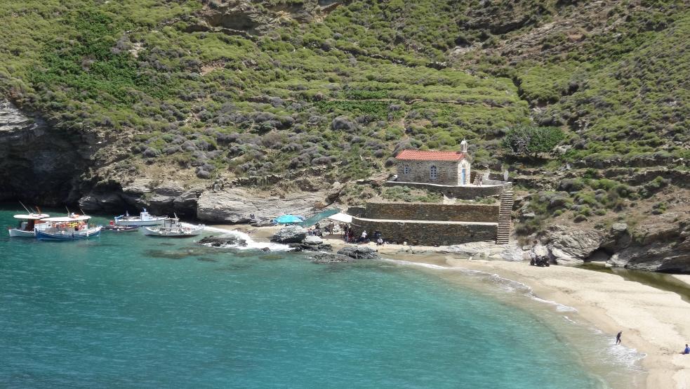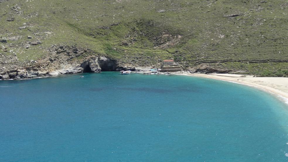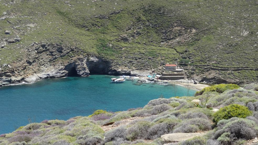 Στην επόμενη φωτογραφία, η παραλία της Αχλας όπως φαίνεται από το εξωκλήσι του Αγίου Νικολάου. Δεξιά στη κορυφογραμμή διακρίνεται και το φανάρι της Γριάς. |
