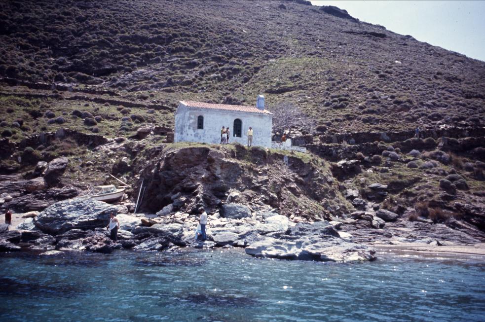 Πάνω, το εξωκλήσι όπως φαινόταν σε φωτογραφία του 1972. Κάτω σε φωτογραφία του 2007, φαίνονται εκτεταμένες παρεμβάσεις με τοιχοποιία που είχε σκοπό τη συγκράτηση του εδάφους για να μην καταρρεύσει το εξωκλήσι καθώς και σε φωτογραφία του 2015 η πέτρινη κλίμακα για άνετη πρόσβαση από την παραλία στο εξωκλήσι. |