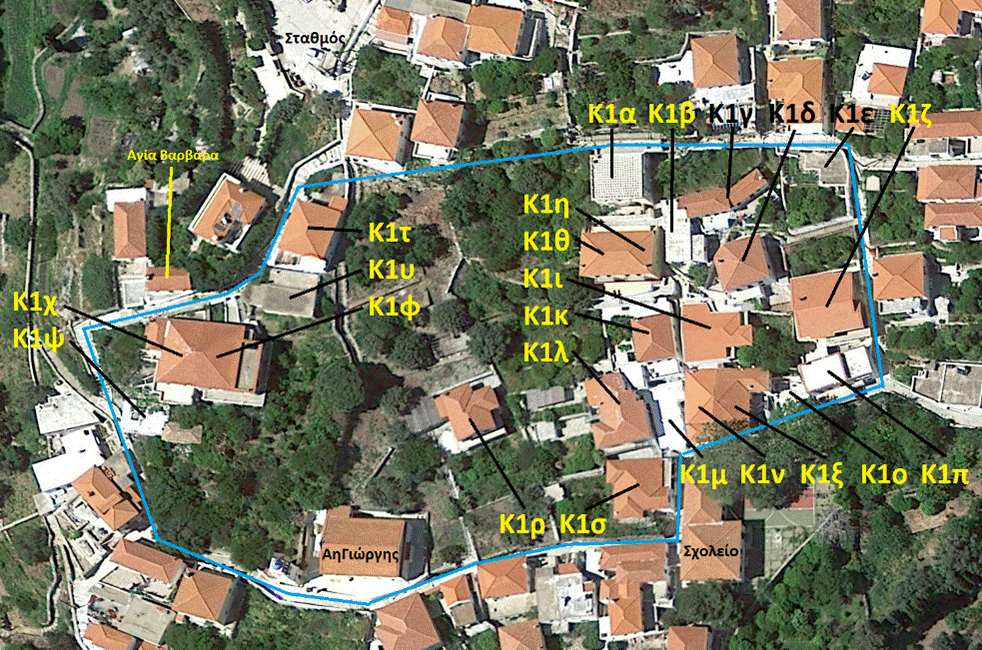 Σπίτια του Κατωχωριού ανάμεσα στους δρόμους που συνδέουν την Παναγία με τον Αη Γιώργη, τον Αη Γιώργη με την Πλατεία και τον νεότερο φούρνο του Ανύση και από εκεί πάλι μέχρι την Παναγία μέσω του δεύτερου δρόμου που συνδέει την Παναγία και το Κατωχώρι.